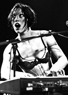 Amanda Fucking Palmer (come ama farsi chiamare) visita la Sala Apolo di Barcellona orfana della metá delle “bambole di Dresda”, Brian Viglione, ma portandosi in valigia le canzoni del suo esordio solista “Who Killed Amanda Palmer”, un giovane violinista, London Chester, e una piccola compagnia teatrale australiana, The Danger Ensemble. E’ quanto basta alla cantante bostoniana per riportare i propri fun in quelle atmosfere da Moulin Rouge in bianco e nero che tanto ci avevano fatto innamorare agli esordi dei The Dresden Dolls. Steven Mitchell Wright, direttore artistico della The Danger Ensemble, è il primo a salire sul palco, insieme a London Chester, per annunciare la morte di Amanda Palmer. Qualcuno l’ha uccisa, come dice il titolo del suo album. Inizia cosí il rito funebre, il feretro di Miss Amanda Palmer, per l’occasione avvolta in un vestito dorato e baby doll, viene portato sul palco dai restanti tre membri del gruppo teatrale. La posizionano sul seggiolino di fronte al piano, posto al centro del palco. Il corpo di Amanda si accascia sui tasti bianchi e neri del piano elettrico, le mani sbattono sulle note. Poco a poco il corpo di Amanda riprende vita, e le sue dita schizzano sui tasti, che suonano le prime note diAstronaut. La Palmer tiene il tempo coi suoi stivali neri e trascina il pubblico nei meandri di “Who Killed Amanda Palmer”. Accompagnata solamente dal violino di London Chester, la regina del punk-cabaret propone brani del suo album solista (Ampersand, Strong Through Music, Guitar Hero), vecchi pezzi dei Dresden Dolls (Bad Habit, Coin-Operated Boy), e cover d’autore (My Favouirte Things, tratta dalla colonna sonora del musical “The Sound Of Music”). La performance della Palmer è complementata dall’attuazione della The Danger Ensemble. Mimica, teatro contemporaneo, e molta sensualitá (o meglio dire sessualitá?) rendono lo spettacolo ancora piú attrattivo. La Palmer scherza col pubblico, racconta aneddoti, ringrazia per averla preferita agli Oasis, che allo stesso tempo stanno suonando nella vicina Badalona, si scusa per aver mangiato e bevuto troppo la sera prima. Se col suo esordio solista Amanda Palmer ci ha dimostrato di essere un’artista completa a dispetto delle “bambole di Dresda”, dal vivo la mancanza della grancassa di Viglione si fa sentire, soprattutto per chi ha avuto la fortuna di vedere l’energia live della band. La Palmer se la cava peró con la bellezza della sua voce, la sensualitá, gli ammiccamenti e quel caschetto rosso che le schizza sugli occhi mentre strapazza la tastiera del suo piano. Ma allora, who killed Amanda Palmer? Nessuno, è piú viva che mai.