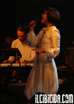 Una cantante eccelsa, inappuntabile. Non le ho sentito compiere una stonatura, un’incertezza vocale fino al penultimo brano. Solo alla fine ha ceduto con qualche quarto di tono mal controllato. Alterna perfettamente voce di testa a voce di petto, sussurra e amplia le emissioni senza perdere di vista le oscillazioni dei brani, sostenendone il candore e le rarefatte atmosfere. A supportare Bat For Lashes in questo tour c’è una band di quattro elementi, tre uomini e una donna, ma lasciatemi dire che la loro presenza è pressoché superflua. Tra pad e loop, è tutto campionato: le basi di ogni brano, a parte il sostegno ritmico del batterista, i cori, persino le seconde voci sono prese pari pari dal disco. Natasha potrebbe andare a zonzo sola con un Mac e il pianoforte per quei 2 brani necessari per dare un tocco d’autunno al set. Che, come di consueto, spinge sul materiale incluso nel recente “The Haunted Man” nella prima parte, sfoderando perle dei primi due album nel finale.
