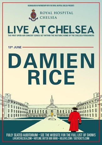 damienricelivelondra2015Dopo quasi 10 anni di attesa, ho visto per la prima volta Damien Rice in concerto. A partire dalla location, è stata una serata dai contorni surreali: per la prima volta nella storia, il Royal Hospital Chelsea, casa di riposo per più di 300 anziani veterani inglesi, ha aperto le proprie porte per ospitare una serie di concerti all’aperto il cui ricavato andrà in beneficenza. Appena varcata la soglia dell’enorme parco dell’ospedale, mi sono sentita come una fortunata nipote alla quale è stato concesso il privilegio di entrare in un mondo privato e speciale per andare a trovare i propri nonni. La sensazione si è fatta man mano più intensa quando, accanto alla gente in fila chilometrica per prendere un panino o una birra e stendersi sul prato in attesa del concerto, ho visto avvicinarsi ultraottantenni ex-soldati con la loro sgargiante divisa rossa ed il loro secchiello per gli spiccioli che racimolavano fondi per beneficenza come se fossero giovani e aitanti boy scout – uno di loro, tutto serio e compito, mi ha detto che avrei dovuto comprare una delle mascotte orsacchiotto a causa della loro “estrema coccolosità”.