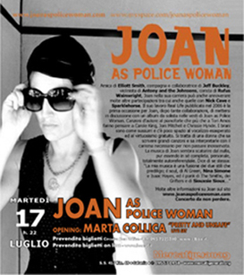 E’ la catanesissima Marta Collica ad aprire le danze della serata tutta al femminile in programma ai Mercati Generali di Catania. La Collica incanta la platea per una mezz’ora abbondante con le delicate melodie del suo ultimo lavoro “Pretty And Unsafe”, abbandonandosi a lunghe cavalcate pianistiche mentre siede ad occhi socchiusi di fronte al suo strumento che a tratti diventa una cosa sola con l’artista. Cinque minuti ancora, sussurra qualcuno dell’organizzazione, e così Marta ha giusto il tempo per un ultimo pezzo prima di lasciare il posto (non solo metaforicamente) alla special guest Joan Wasser, a Catania con il suo progetto Joan As Police Woman. Nota ai più per essere stata l’ultima compagna di Jeff Buckley, la Wasser ha però inanellato nel corso della sua carriera tutta una serie di collaborazioni illustri, fra cui spiccano quelle con Antony & The Johnsons, Rufus Wainwright, Nick Cave e Sparklehorse, ma solo di recente ha dato alla luce il suo primo lavoro da solista, “Real Life”. Ed è l’esecuzione per intero del suo lp d’esordio il perno dell’esibizione: Flushed Chest, The Ride, Save Me, Feed The Light e Christobel si susseguono senza soluzione di continuità, intervallate solo da qualche scarna parola in italiano, pronunciata da Joan per interagire col pubblico assiepato sulle poltroncine innanzi al palco. Joan siede adesso al piano, si alza poi per imbracciare la chitarra, trovando anche modo per far sorridere il pubblico ricordando che prima d’ora non aveva mai suonato in mezzo ai cactus, riferendosi alle numerose piante di fichi d’India che ornano la location. L’evocativa We Don’t Own It, dedicata allo scomparso amico Elliot Smith, risulta uno dei momenti più intensi, momenti che si moltiplicano nel gran finale in cui la band (Joan è accompagnata da Ben Perosky alle pelli e Rainy Orteca al basso ed ai controcanti) esegue una dopo l’altra le perle di “Real Life”: la soffice Anyone (brano tra i migliori del lotto), I Defy ed il singolo Eternal Flame ci presentano così una cantautrice completa sotto ogni aspetto, dotata di una voce che non è azzardo paragonare a quella della tanto osannata Tori Amos. Ad esibizione ultimata, l’impressione che rimane è quella di un’artista al primo capitolo di quella che sarà una lunga storia.