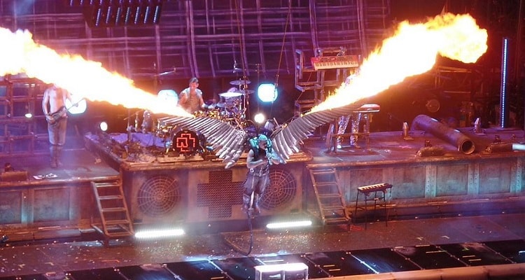 Sul palco vengono calate delle ali ed è ora di Engel cantata quasi per intero a mezz’aria da Till Lindemann, affrancato alle ali che prima si illuminano e poi lanciano sbuffi di fuoco che raggiungono tutta la larghezza del palco. Alla fine inchino e un altro ringraziamento al pubblico. Dopo essere usciti tutti dal palco però le luci non si accendono, non è ancora finita. Infatti si accende un’unica luce che illumina a spot il bassista Oliver Riedel che, seduto a fianco alla batteria, lancia i primi accordi di Frühling In Paris. Tutta l’Arena ascolta estasiata e canta con Till il ritornello in francese.