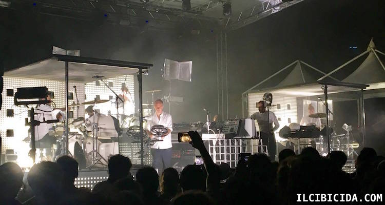SOULWAX – Il cambio palco che precede l’ingresso dei Soulwax, headliner di chiusura del festival, espressione massima del concetto di multidentità, dura più dei precedenti. Questo particolare desta non poca attenzione da parte del pubblico, già curioso di capire come verrà fuori la trasposizione dal vivo di “From Deewee”, il disco registrato in unica take e contenente tracce ispirate dal “Transient Program For Drums And Machinery” tour del 2016. Finalmente le luci si spengono, si sente un urlo pazzesco provenire dal backstage e la batteria suonare rintocchi quasi sordi. Poi il caos, il palco e la platea s’illuminano a giorno e con l’ultimo colpo di batteria cadono i teloni che scoprono i tre batteristi, Victoria Smith, Igor Cavalera (Sepultura) e Balke Davies, con David e Stephen Dewaele a centro stage per iniziare il viaggio. Do You Want To Get Into Trouble?, Krack, Is It Always Binary, Missing Wires, Glass, The Singer Has Become A Deejay tutte in sequenza e senza alcuna soluzione di continuità sono una scarica di ritmi serrati, con Stepehen Dewaele che si alterna tra synth, voci e rototom drum. I Soulwax lo avevano detto e lo fanno davvero: suonano elettronica live con le batterie vere! E mentre Igor Cavalera sembra dare fondo a tutte le sue energie per dare vita, insieme agli altri, a una perfomance bestiale (anche se a lungo andare un po’ ripetitiva, per i non amanti del genere). Il microfono binaurale AKG a forma di testa umana, che cattura il suono nelle sue orecchie sinistra e destra, protagonista della copertina di “From Deewee” e posto al centro del palco, inizia a roteare a metà performance senza più smettere. Come lui, anche il pubblico. (4/5)
