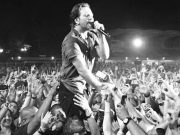 Lo guardi. Ha la solita t-shirt, la solita camicia a maniche corte. Le sue braccia sono perlate di sudore mentre imbraccia la chitarra. Canta:...